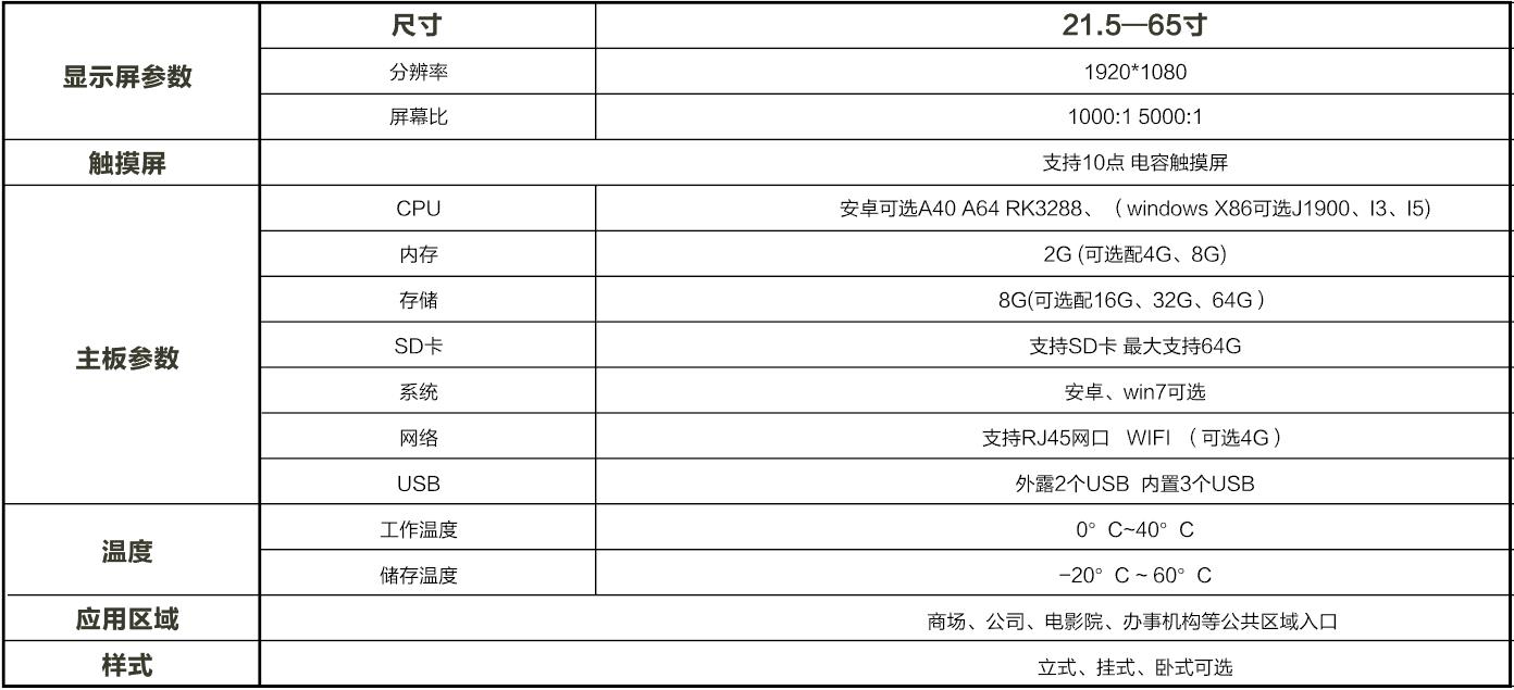 超薄機身;質(zhì)感拉絲金屬;高清畫質(zhì);觸摸極速反應(yīng);智能分屏;智能遠(yuǎn)程信息發(fā)布;可定時開關(guān)機;提前設(shè)定節(jié)目源;鋼化玻璃屏幕;可定制專屬LOGO、多種顏色、尺寸可選。