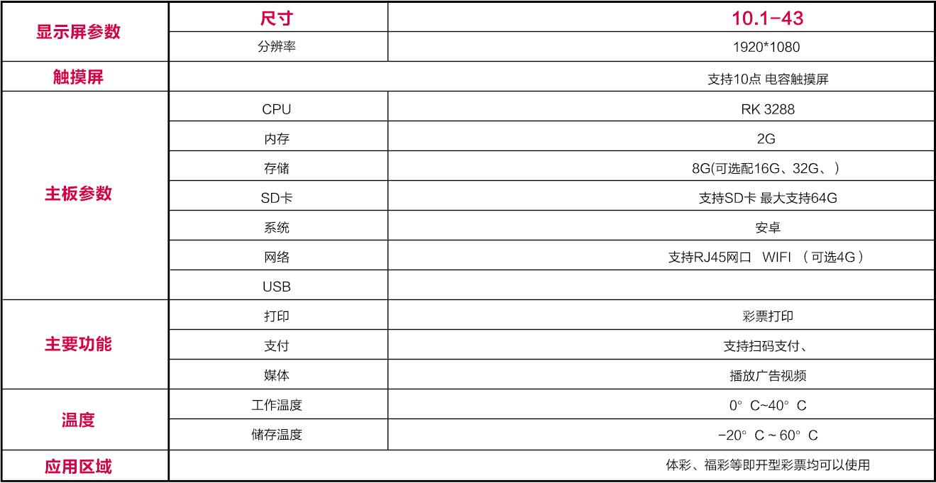 體積小、重量輕、功耗低、安裝簡單結構,屏表面防撞擊防劃傷,WIFI/4G(可選),視頻、圖片、文字無線傳送功能。功能齊全,能查詢歷史開獎記錄,查詢下注方法,自助選號、下注,操作方便。